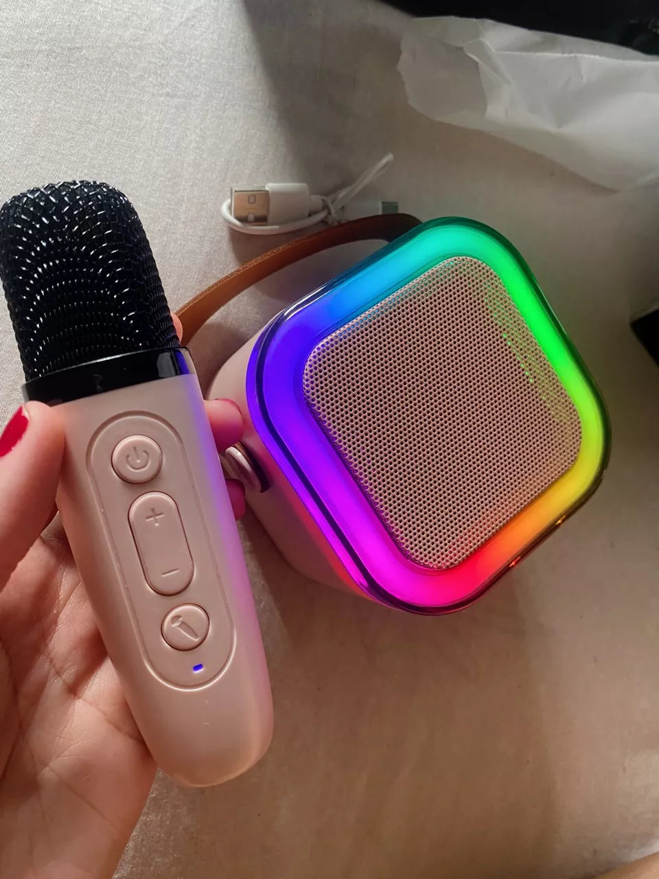 Lo compré para una reunión familiar y terminó siendo el centro de atención. Los micrófonos funcionan súper bien y las luces se ven hermosas.